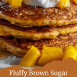 Fluffy and sweet brown sugar peach pancakes topped with fresh peaches and a sprinkle of brown sugar, perfect for a comforting breakfast or brunch treat.