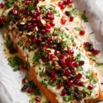 - Assemble and Serve: Spread a thick (~0.8 cm / 1/3 inch) layer of the chilled creamy dill sauce over the top of the salmon. Then pile on the holiday tapenade, scatter pomegranate seeds generously, and sprinkle remaining chopped parsley. Drizzle with lemon juice.