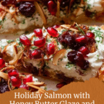 This elegant Christmas Baked Salmon recipe features a moist salmon side glazed with a honey-butter sauce, baked and then broiled to achieve a caramelized finish. Topped with a creamy dill sauce and a vibrant holiday tapenade of cranberries, toasted almonds, pomegranate seeds, and fresh herbs, it offers a festive, flavorful centerpiece perfect for special occasions or holiday dinners.