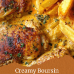 A creamy and flavorful Boursin Chicken and Potatoes recipe featuring tender baked chicken and golden baby potatoes topped with rich, herby Boursin cheese for an easy and comforting meal.