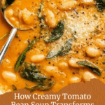 A rich and creamy tomato bean soup combining wholesome white beans, fresh vegetables, and aromatic Italian herbs. This comforting soup is smooth, velvety, and perfect for a cozy meal, featuring a balance of tangy tomato paste and parmesan cheese with a touch of cream and spinach for added nutrition.