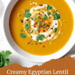 A comforting and flavorful Egyptian Lentil Soup (Shorbet Ads) made with red lentils, aromatic spices, and vegetables, simmered to tender perfection and blended to a smooth, creamy texture. This traditional soup is perfect as a nourishing appetizer or light meal and can be customized with a variety of fresh garnishes like coconut milk, cilantro, lemon juice, and olive oil.