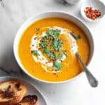 - Serve with garnishes: Ladle the soup into bowls and top with optional garnishes such as a swirl of coconut milk, fresh cilantro, crushed red pepper flakes, a squeeze of lemon juice, and a drizzle of extra virgin olive oil to enhance the flavors.