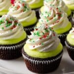These Festive Grinch Mini Cheesecakes are a delightful and easy holiday treat featuring a creamy green cheesecake filling with a crunchy cookie crumb crust. Perfect for holiday parties or festive gatherings, these mini cheesecakes are decorated with adorable red candy hearts or frosting, making them a visually appealing and delicious dessert that everyone will love.