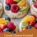 Fruit Pizza Cookies are soft, sugar cookies topped with a luscious cream cheese frosting and an array of fresh, colorful fruits. This delightful dessert combines the classic appeal of sugar cookies with the fresh, tangy sweetness of berries, kiwi, banana, and mandarin oranges, creating a vibrant and tasty treat perfect for any occasion.
