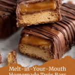 Store the homemade Twix bars in an airtight container at room temperature for up to a week. For longer storage, refrigerate them for up to two weeks. Allow chilled bars to come to room temperature before serving for the best texture. Avoid freezing to preserve caramel consistency.