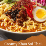 Khao Soi is a comforting Thai coconut noodle soup featuring tender chicken simmered in a rich, fragrant curry coconut milk broth, served over soft boiled noodles. This delicious and creamy soup is spiced with traditional Thai curry paste and warming spices, making it a perfect dish for a cozy meal.