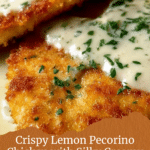 Lemon Pecorino Crusted Chicken with Creamy Lemon Sauce is a flavorful and elegant dish featuring tender chicken breasts coated in a zesty pecorino and panko crust, pan-fried to golden perfection and topped with a rich, creamy lemon sauce infused with garlic and Pecorino Romano cheese. This recipe balances crispy texture and tangy, savory notes, perfect for a sophisticated yet easy dinner.