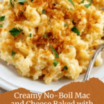 Keywords: no-boil macaroni and cheese, baked mac and cheese, creamy mac and cheese, cheddar Parmesan mac and cheese, easy macaroni and cheese