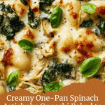 A delicious one-pan creamy spinach and artichoke gnocchi dish that combines tender potato gnocchi with vibrant spinach, tangy artichokes, and a rich cheese sauce, finished off with a golden baked cheese topping for a perfectly comforting meal.