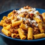 Store any leftover Rigatoni Bolognese in an airtight container in the refrigerator for up to 3 days. Reheat gently on the stovetop or in the microwave, adding a splash of water or milk to loosen the sauce if needed. This dish also freezes well for up to 2 months—defrost overnight in the fridge before reheating.