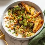 - Assemble Bowl: Spread the garlic confit sauce as a base on your serving plate or bowl. Top with the roasted potatoes, chickpeas, and broccoli. Garnish with chopped scallions and toasted almonds. Serve warm and enjoy!