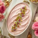 - Step 8: Before serving, optionally pipe whipped cream on top and garnish with food grade rose buds and silvered pistachios.