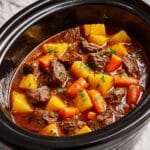 A hearty and flavorful slow cooker Guinness beef stew, featuring tender chunks of beef braised in rich Guinness beer and beef broth, accented with aromatic herbs and vegetables for a comforting and satisfying meal perfect for cozy dinners.