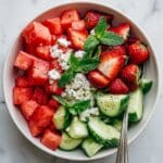 Keywords: Strawberry salad, Watermelon salad, Feta cucumber salad, Summer salad, No-cook salad, Refreshing fruit salad, Mint salad