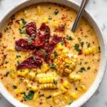 This sun dried tomato corn chowder is a comforting blend of sweet corn, smoky spices, and creamy texture, perfect for cozy evenings. Topped with crispy goat cheese croutons, it offers a delightful contrast of flavors and textures that will keep you coming back for more.